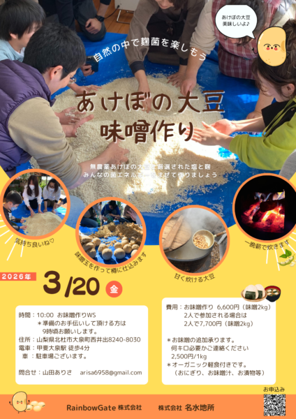 News & Topics, お知らせ 2026.3.20(金)あけぼの大豆味噌作り!! by edit@meisuijisyo.jp 2026年3月8日 2026年3月20日「あけぼの大豆味噌作り」を開催します!! ご参加お待ちしております♪ 問合せ:山田ありさ arisa6958@gmail.com