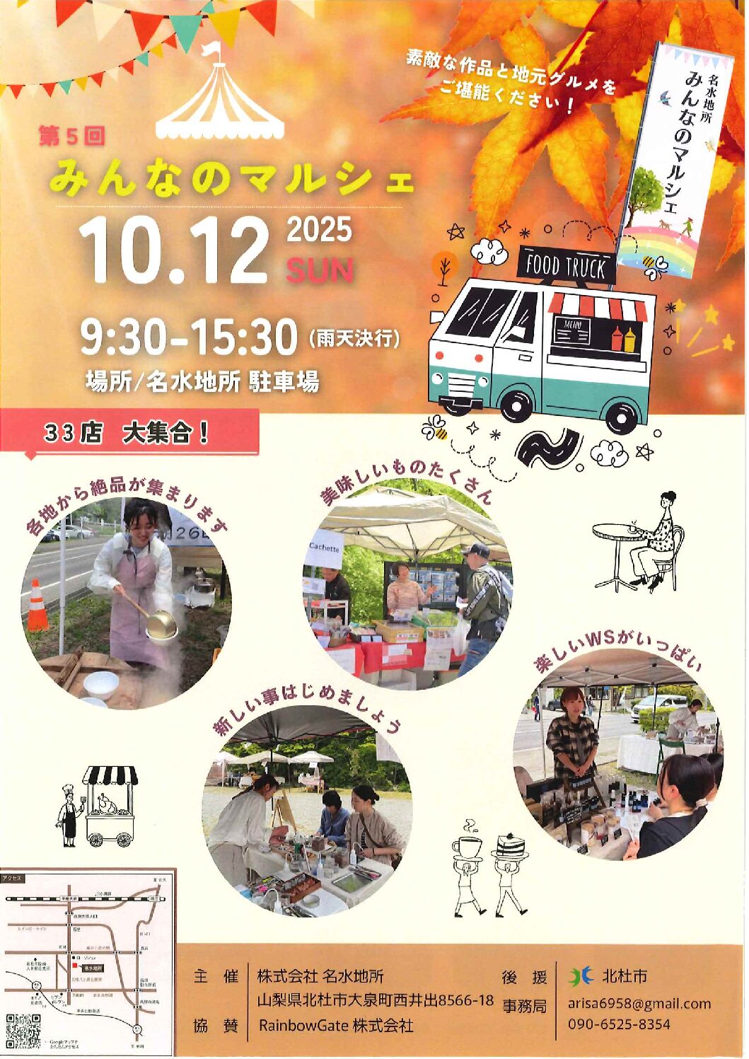 名水地所にて「みんなのマルシェ」を開催します!! 沢山の出店があります。 是非遊びに来てください♪